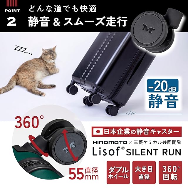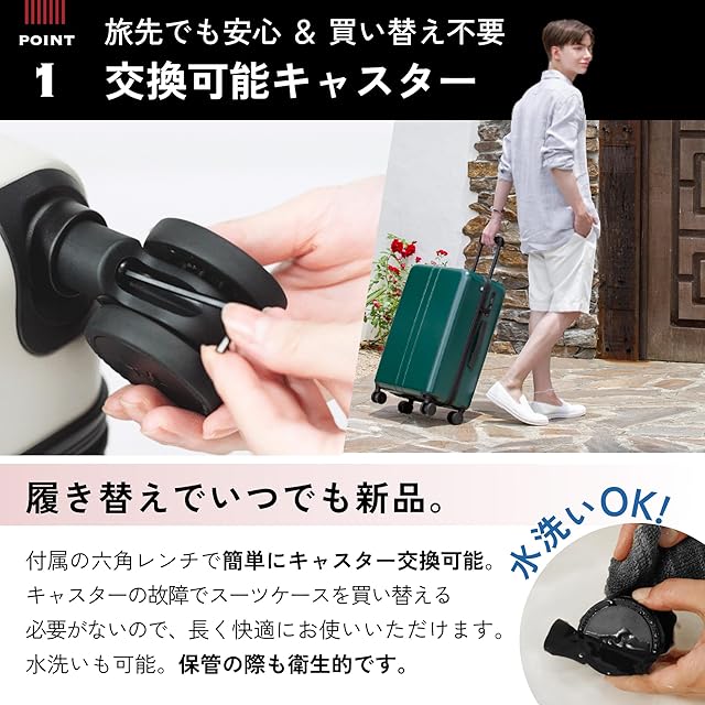 【取り外し可能な静音キャスター】HINOMOTO製の超静音キャスター。従来のキャスターに比べて走行時の騒音を20デシベルカットした最新タイヤ素材。55mm直径の大きめダブルホイールで、走行ラクラク。付属の六角レンチで簡単にキャスター交換ができるため、キャスターの故障でスーツケースを買い替える必要がありません。加水分解しない素材なのでキャスターの丸洗いも可能。 ※別売りのスペアキャスターも発売中。※交換用のキャスターは付属しておりません。
