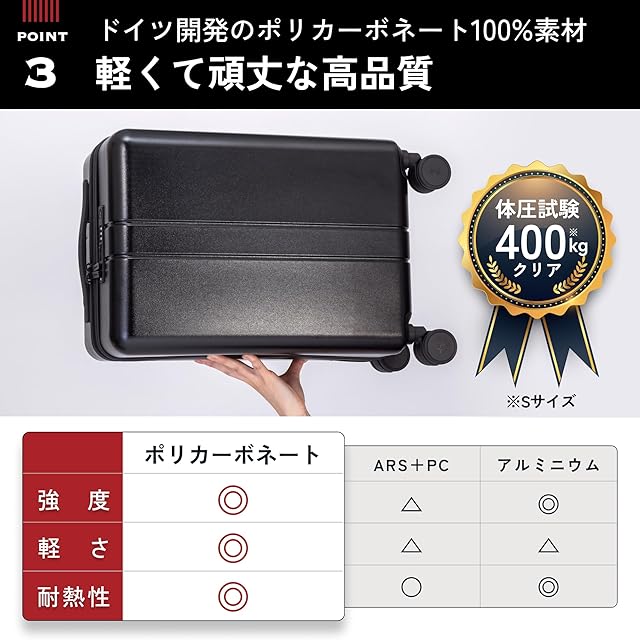 【軽くて、強い。収納力もバッチリ】軽さと強さを兼ね備えた、ドイツ企業開発のポリカーボネート100%の素材。400kg以上の圧力にも耐えうる優れたケース素材が大切な荷物を守ります。36Lの大容量なのに、本体の重さは約2.9kgと超軽量。女性やお子様でも持ち上げられる軽さです。A4サイズの書類や13インチノートパソコンが入るメッシュポケットとクロスベルト付きで、整理整頓がしやすいレイアウト。