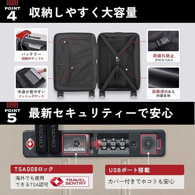 【USBポート付きTSAロック・3段階調節キャリーバー】最新セキュリティーのTSA008モデルを採用。暗証番号タイプなので、鍵の紛失のリスクがありません。USBポート搭載で、モバイルバッテリーを入れたまま充電可能。3段階調節キャリーバーは使用シーンや身長に合わせて使い分けいただけます。