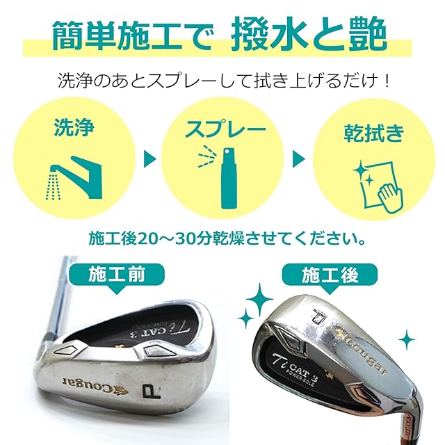 【撥水×防汚×艶出しが1本で】ゴルフクラブの光沢を復元し、雨・湿気・紫外線から守る撥水コーティングを形成。表面に皮膜が残ることで、手垢・水垢も防止できます。