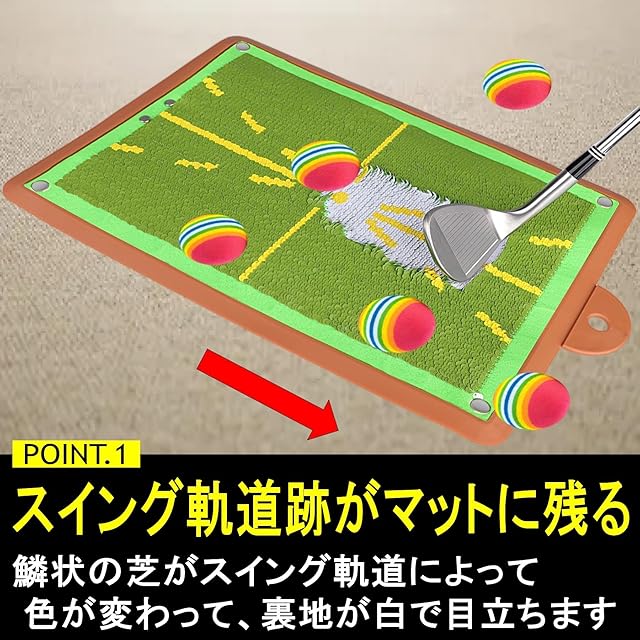 ✅【フォーム確認ができる!スイング軌道跡がマットに残る、鱗マット】鱗状の芝がスイング軌道によって色が変わって、裏地が白で目立ちます。クラブで逆方向に撫でれば簡単に元に戻り、何度も繰り返し使用しても破れにくい仕様です。自身では気づかなかった欠点や癖が可視化され、練習効率がアップします。うろこマットの裏面には滑り止め加工を施し、フローリングの上でショットしてもマットがズレにくい仕様。