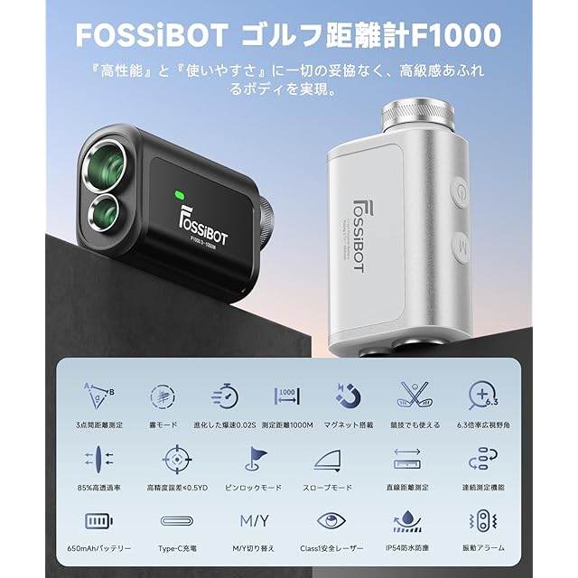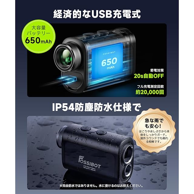 【IP54 防水|大容量 650mAh|測距範囲 3-1000m】FOSSiBOT F1000 ゴルフスコープの測定範囲 3~1000 メートル(1093 ヤード)、905nm レーザー波長を採用、穿透性に優れ大気散乱を抑え、データ信頼性が高く、多場面の測距ニーズに応えます。650mAh バッテリー搭載、満充電で約 20,000 回測定可能。20 秒無操作で自動 OFF の省電力機能で長時間持続、頻繁な充電不要。Type-C インターフェース採用、約 2 時間で満充電、充電簡便かつ効率的。IP54 防塵・防水を備え、霧モードとの組み合わせで雨天・霧の日など過酷な天候でも正確測定可能、全天候安定使用をします。