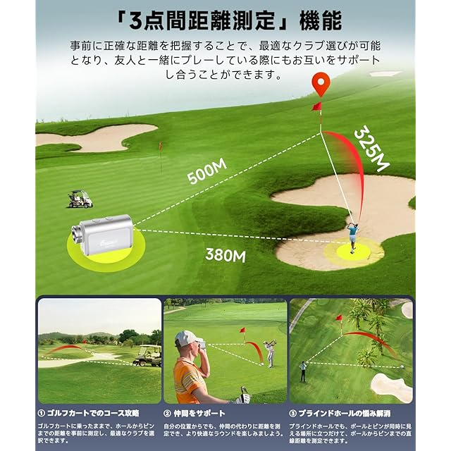 【最新機能3点測距モード】FOSSiBOT F1000 ゴルフ距離測定器の三点間測距機能は、ゴルフシーンに特化し、多様な測距ニーズに柔軟に対応。ゴルフカートに乗ったままホール - ピン間距離を事前測定して的確にクラブ選択したり、自分の位置から仲間の代わりに測距して複数人プレイをよりスムーズにしたりも可能。さらにプラインドホール(視界遮断ホール)では、ボールとピンが同時に見える場所に立ち、「ピン狙い→ボール狙い→電源ボタン短押し」の簡単 3 ステップで、ボール - ピン間直線距離を自動算出・表示。この機能で複雑なシーンの測距難題を解消し、ゴルフのスイングをより効率的かつ楽にします。
