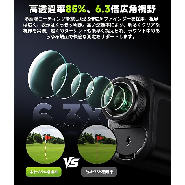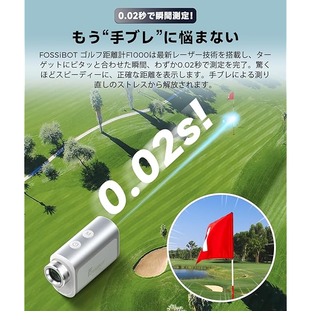 【LCD 黒表示|0.02s 測定|6.3 倍広角視野|高透過率85%】FOSSiBOT F1000 ゴルフ 距離計は、85% 高透過率の LCD ビューファインダーを搭載し、強い光の下でもデータを鮮明に表示し、素早く正確な距離を把握できます。多層膜コーティングの光学レンズと 6.3 倍の拡大倍率を採用し、広い視野とリアルな色彩再現を実現し、遠くの目標を簡単にロックできます。独自の測距技術を活用し、最速 0.02 秒での応答を実現しており、手ブレ補正機能がなくても安定した測定が可能です。さらに視力補正ピント調整リングを搭載し、さまざまなユーザーの視力に適応し、遠距離の目標に正確にピントを合わせることをします。