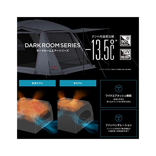 【ダークルームテクノロジー】日差しが強い日や気温が高い日は、熱中症のリスクが高まります。コールマンのダークルームテクノロジーは、日光を90%以上遮断して、テント内の温度上昇を抑制します。夏のキャンプでは、非常にお勧めの機能です。上部に採光用のクリアウィンドウを装備していますので自然光を取り込むことも可能です。