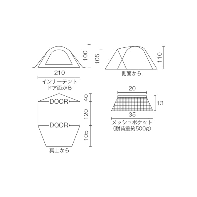 【材質】フライ/75D ポリエステルタフタ(ダークルーム、UVPRO、PU防水、シームシール) インナー/68D ポリエステルタフタ フロア/75Dポリエステルタフタ(PU防水、シームシール) ポール/(メイン)FRP 約φ8.5mm (フロント)FRP 約φ9.5mm