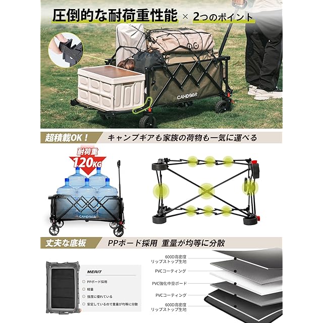 【圧倒的な耐荷重性能&軽量設計】軍用レベルの超耐久600Dオックスフォード生地を採用したキャリーカート 折り畳み型。防水性・引き裂き強度に優れ、長期間使用可能!高強度アルミ合金フレームと補強構造で、120kgまでの荷重に耐えるキャリーカート。本体重量わずか7.3KGで、軽量ながらも驚異の耐荷重を実現。キャンプやアウトドアに最適!伸縮自在ハンドル&操作性を大幅アップ。小柄な女性から背の高い男性まで、誰でも楽々操作できるキャリーワゴン。