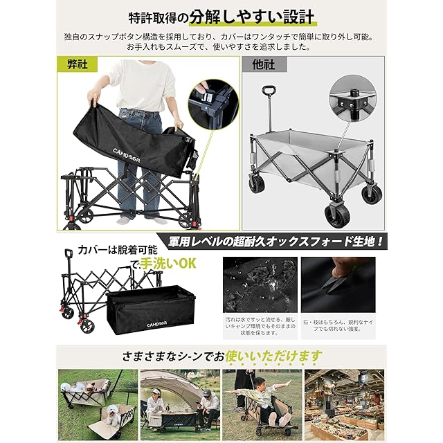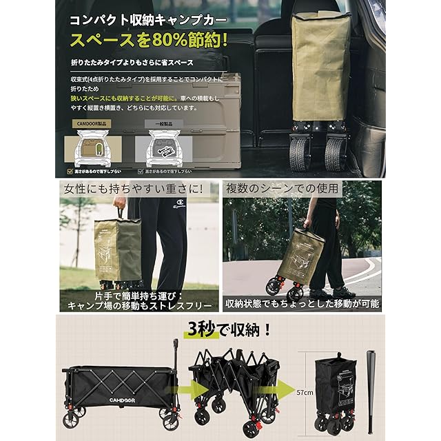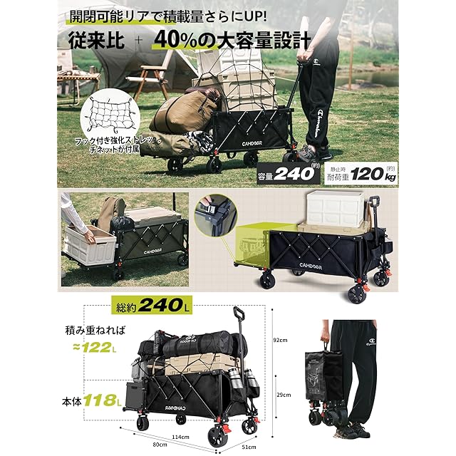 CAMDOOR 後ろ開け キャリーワゴン 長物対応【3秒で収納·大容量·超軽量】アウトドアワゴン 軽量 静音 キャンプカート 大容量240L 耐荷重120kg コンパクト自立収納 キャリーカート BBQ 釣り 運動会 荷物運び 引っ越し ワンタッチ収束式