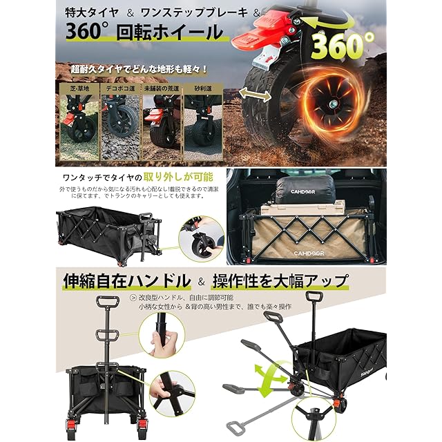 【全地形対応タイヤ+ワンプッシュブレーキ】特大タイヤ、360°回転ホイールを備えたキャリーカート 4輪モデル。幅広タイヤで、砂利道・悪路・坂道でも安定走行。ワンプッシュブレーキ搭載で、15度の傾斜でも安全に停止。大型タイヤは取り外し可能で、車内清掃も楽々。キャンプ キャリーワゴンとしても高性能を発揮します。