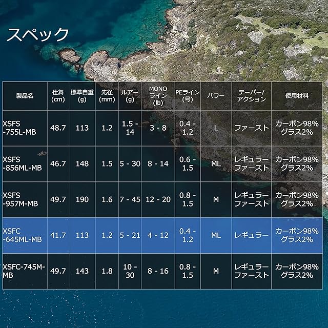 仕舞 (cm)48.7●標準 自重(g)113●先径(mm)1.2●ルアー (g)1.5 - 14●MONOライン (lb)3 - 8●PEライン (号)0.4 - 1.2●パワーL●テーパー/アクションファースト●製法チューブラー●使用材料カーボン98%,グラス2%