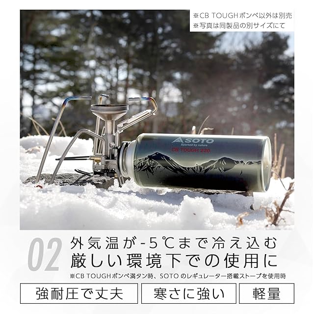 【雪山・寒冷地対応】寒冷地でも使用可能なハイパワーなCB缶です。TrekMaster(トレックマスター)ST-331、TriTrail(トライトレイル)ST-350と組み合わせることで、-5℃の環境下でも火力不足やドロップダウンが起こりにくくなります(※ボンベ満タン時)
