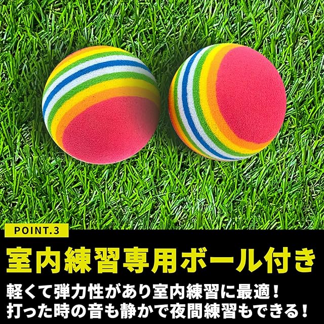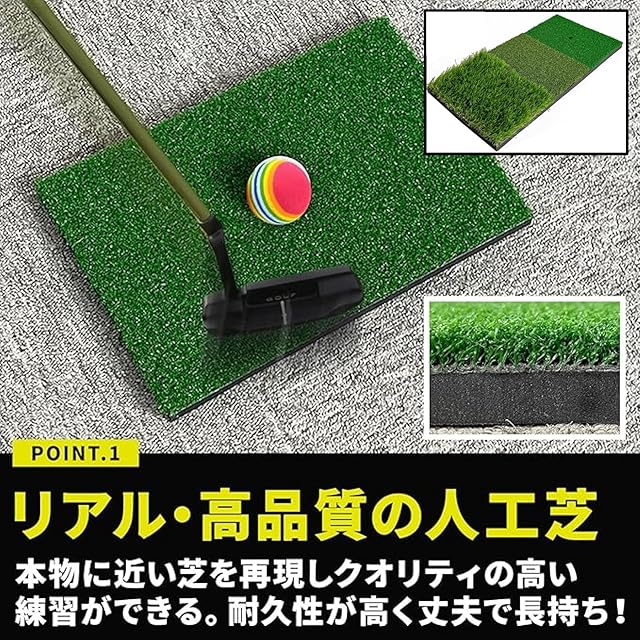 ✅【衝撃吸収!自宅の床を傷付けない、厚みのある芝マット】芝風マットの裏面には滑り止め加工を施し、フローリングの上でショットしてもマットがズレにくい仕様。人工芝の下には厚みのあるスポンジを使用し、人工芝とスポンジによる2層構造により打った際の衝撃を吸収しやすい仕様。