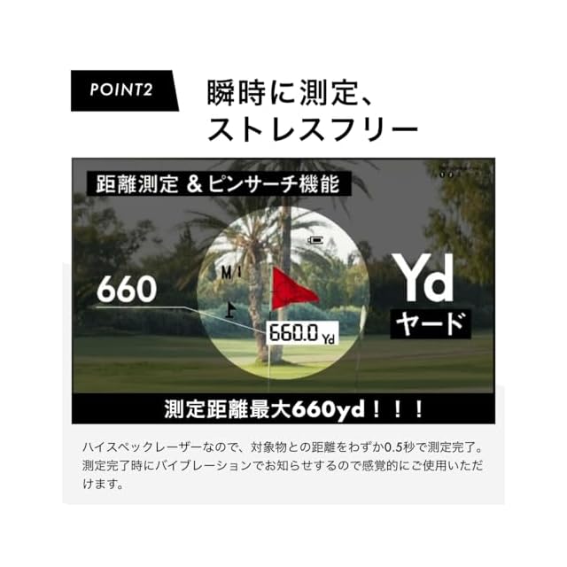 ⭐【距離測定】高品質の精度の高い測定距離を実現し、最大測定距離660ydまで測定可能。メートル(m)/ヤード(YD)の表示切替が可能