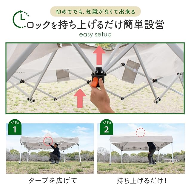✅【強度・安定性に優れたタープテント】 強靭なスチール製フレームを採用し、しっかりとした設置が可能。アルミ製に比べて重量がある分、風や地面の状態に左右されにくく、安定感が抜群です。ペグを打ちにくい場所でも自立できる設計なので、ビーチや芝生、コンクリートの上など、さまざまな環境で活躍します。※ペグ未使用時には突風や強風などでテントが破損する場合がございます。風・雨などの自然現象による破損につきましてはの対象外となりますのでご注意ください。