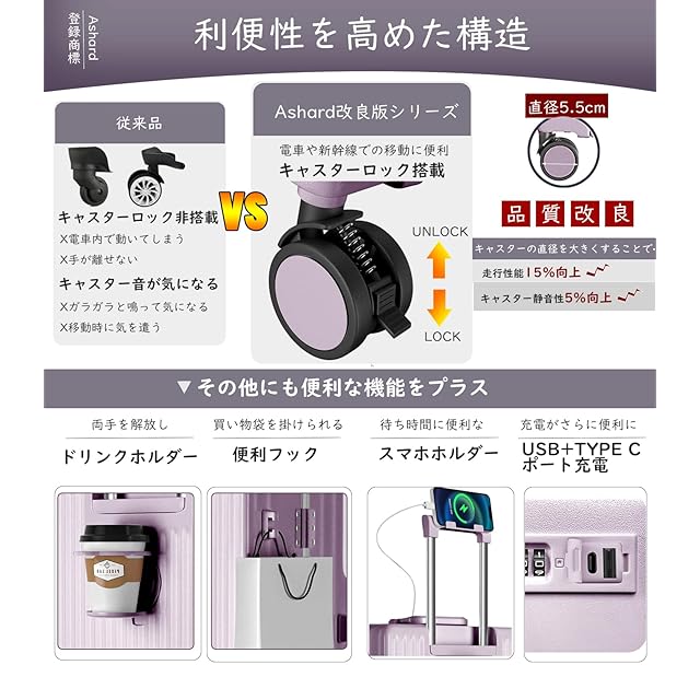 「キャスター ストッパー付き 、USB+Type C充電ポート付き 、 カップホルダーとスマホルダーを付く」 ASHARDフロントオープンシリーズのバージョンアップモデルです。走行中の揺れる電車内でもストッパー(ブレーキ)機能でピタっと自立。乗降時や座席の離着席時などではすぐにストッパー解除ができるのでスムーズに移動を再開することができます。スーツケースにモバイルバッテリーを収納するポケットがついており、 USB+Type Cポートの充電口が外にあることで、いつでもどこでも充電できます。便利な折りたたみ式ドリンクホルダー付き。バックカップホルダー、ミルクティーカップ、傘いつでも配置でき、旅行をより便利にすることができます。レバーの上部にはスマホルダーが付いているので、フライトの待ち時間に両手が自由になり、外出先でもリラックスできます。