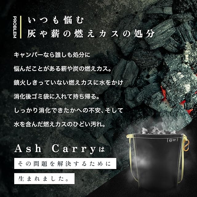 カラビナ付属モデルです! 【炭や燃えカス処理の悩みを解決!】アッシュキャリーは使用後の炭や薪の燃えカスを安心安全に持って帰れる耐熱性・難燃性の生地で作られた、火消し袋です。折りたたみ収納可能でコンパクトで携帯性が高く、今やアウトドアに必須のアイテム!キャンプやバーベキュー等焚き火終了後に完全に消化し、薪や炭を持ち帰れます。マチ付き自立型で耐熱性素材で作られており、まだ少し熱を持った使用後の炭や薪の燃えカスを入れたら、袋の口を締め内部を酸欠状態にする事で、緩やかで完全な鎮火を促し、安心安全に炭を持ち帰る事ができる炭処理火消し袋です。