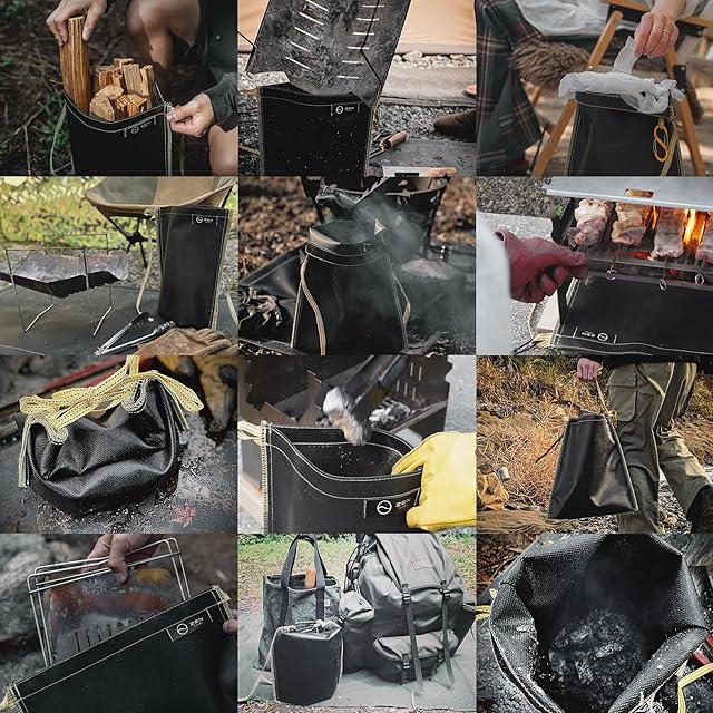 【大容量・自立式】バーベキューやキャンプの後処理に折りたたみコンパクトな火消し袋を開口して薪や炭を処理して下さい。袋の下部のマチにより自立可能で安心に炭消袋を取り扱えます。口を外側に折り返せば、口が広くなるため簡単に燃えカスを投入できます。