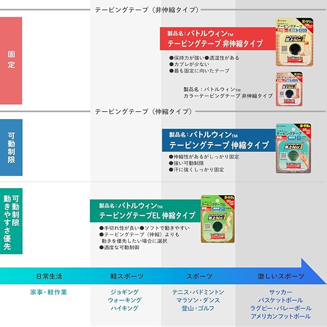 【スポーツテーピングテープ】サッカーやバスケットボール、バレーボールなど、激しいスポーツのケガや傷害の応急処置から予防まで、アスリートをサポート。