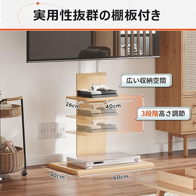 余裕な棚板収納スペース:幅40×奥行26cmの棚板付きで、余裕がある収納空間でゲーム機器やDVDも収まります。また、3段高さ調節で置く物やテレビのサイズに合わせて細かな高さ調整できます。