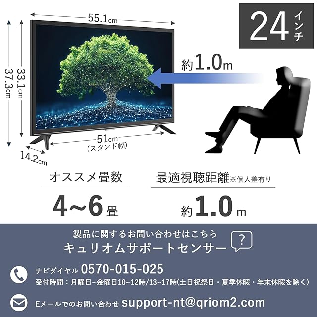 ✅【商品仕様】◇本体寸法(幅×奥行×高さ):[スタンドなし]551.4×83.8×331.1mm [スタンドつき]551.4×142.2×372.9mm ◇本体質量:[スタンドなし]2.5kg [スタンドつき]2.6kg ◇画面サイズ:24V型 ◇解像度:1366×768 ◇コントラスト比:3000:1 ◇視野角(最小値):左右=約178°/上下=約178° ◇応答速度:8.5ms ◇音声出力(スピーカー):3W+3W ◇チューナー:地上デジタル×2、BS、110度CSデジタル×2(ダブルチューナー)※1つは視聴専用・2番組同時録画は非対応 ◇壁掛け寸法:VESA規格200×100mm ◇定格電源:AC100V(50/60Hz) ◇消費電力:40W ◇HDMI:HDMI Ver.1.4a×2 CEC機能に対応※HDMI入力1のみARCに対応 ◇USB端子:USB2.0×2 ◇付属品:リモコン、リモコン用単4形乾電池×2(動作確認用)、miniB-CASカード、miniAV交換アダプター、スタンド、スタンド固定ネジ×4、書付き取扱説明書
