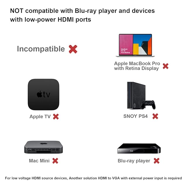 幅広い互換性 - HDMI-VGAアダプターはデスクトップパソコン、ノートパソコン、ウルトラブック、ノートブック、Chromebook、Raspberry Pi、Intel Nuc、Roku、PS3、Xbox One、Xbox 360、Wii U、セットトップボックス、TV BOX、その他のHDMIポートを持つ機器に使えます。ブルーレイや、ソニーPS4、Apple MacBook Pro Retinaディスプレイ、Mac mini、Apple TVなどを含む低出力HDMIポートを持つ機器には対応しません。