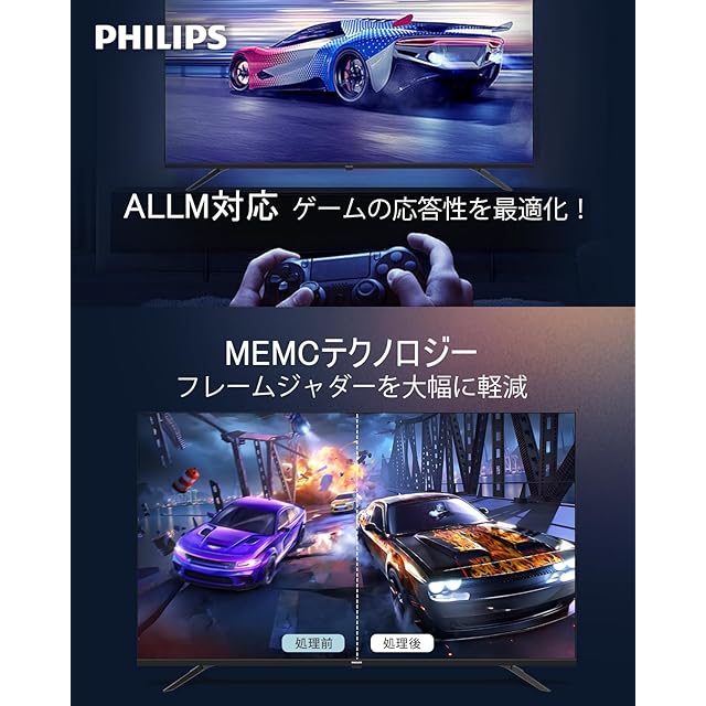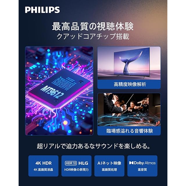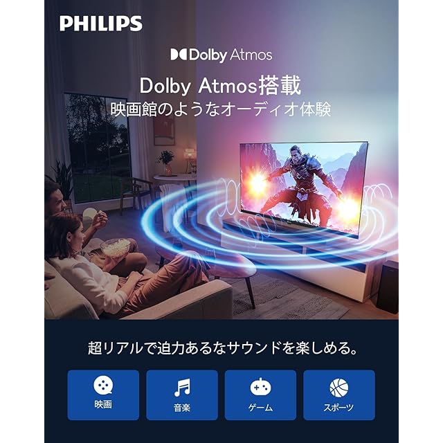 【4K高画質・Dolby Atmos搭載】Philips 43型 4K テレビで、まるでその場にいるような没入体験を!・4K UHD 解像度:高精細画質で、繊細なディテールまでくっきりと再現。まるで目の前にあるようなリアルな映像をお楽しみいただけます。・Dolby Atmos サウンド:迫力満点の立体音響で、映画やゲームの世界にどっぷり浸りきれます。まるでサウンドに包まれるような体験をお届けします。・ALLM (自動低遅延モード):** ゲームモードを自動で切り替え、入力遅延を最小限に抑えます。一瞬の操作も見逃さず、快適なゲームプレイを実現します。・MEMC (動画補正技術):高速な動きもなめらかに描写。スポーツ観戦やアクション映画も、ブレのないクリアな映像でお楽しみいただけます。