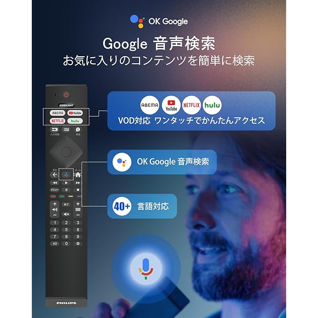 【音声リモコン操作】アプリへのダイレクトボタンが付いた音声入力対応リモコンが付きます。「ABEMA」「YouTube」「NETFLIX」「hulu」へのダイレクトボタンを搭載しています。またGoogleアシスタント搭載で映画や番組、アプリなどを音声で検索できます。※音声検索にはリモコンのペアリングが必要です。