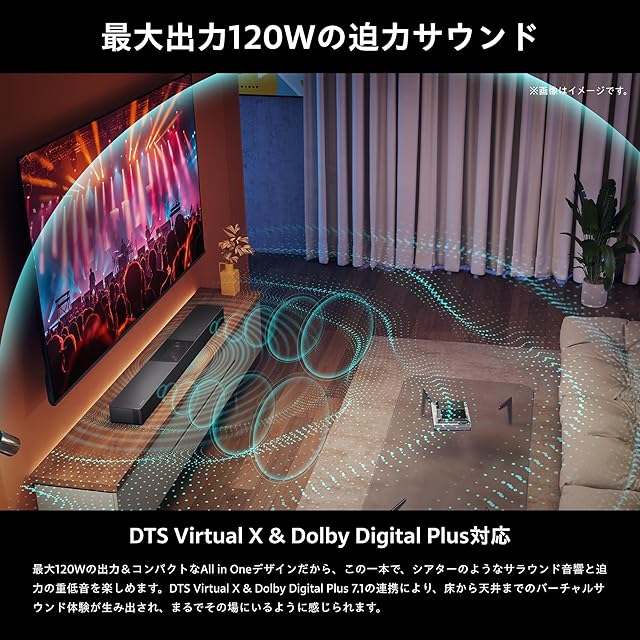 【DTS Virtual X& Dolby Digital Plus対応】最大120Wの出力を備え、この一台で、シアターのようなサラウンド音響と迫力の重低音を楽しめます。DTS Virtual X& Dolby Digital Plus 7.1の対応により、バーチャルサウンド体験が生み出され、まるでその場にいるように感じられます。