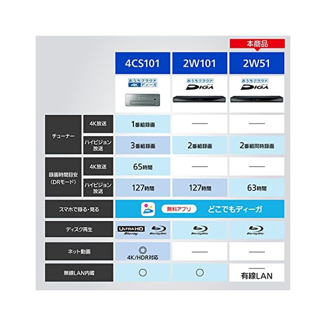 商品内容:3) 【DMR-2W51】2番組同時録画 / 500GB(最大約675時間)
