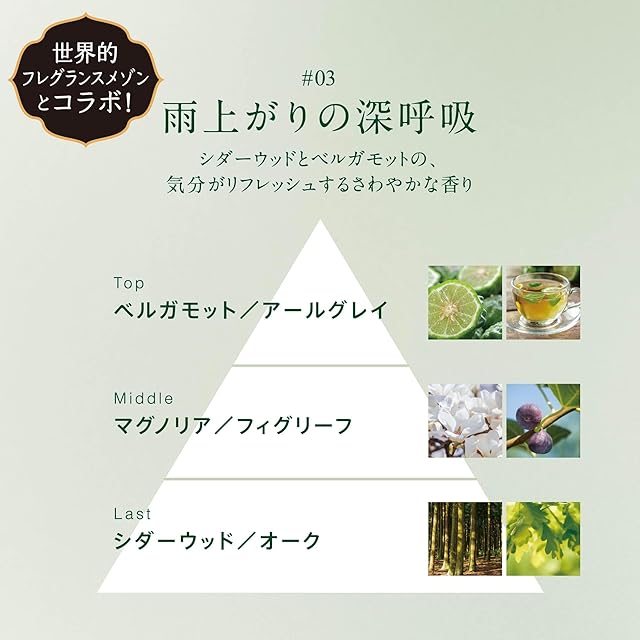 「シダーウッド&ベルガモットの香り」シダーウッドとベルガモットの気分がリフレッシュするさわやかな香り:トップ:ベルガモット・アールグレイ/ミドル:マグノリア・ふぃぐリーフ/ラスト:シダー・オーク。