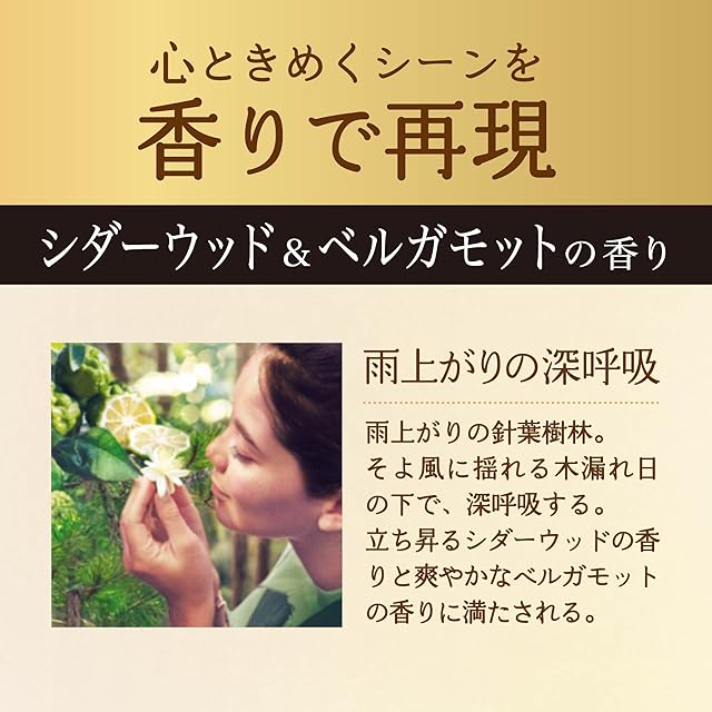 柔軟剤の香りで心ときめくシーンを再現。「雨上がりの深呼吸」:雨上がりの針葉樹林。そよ風に揺れる木漏れ日の下で、深呼吸する。立ち昇るシダーウッドの香りと爽やかなベルガモットの香りに満たされる。