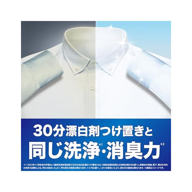 30分漂白剤つけ置きと同じ洗浄・消臭力*(*2023年11月時点の市場No.1酸素系液体漂白剤で30分のぬるま湯のつけ置きとNo.1液体洗濯用洗剤との併用比較(P&G調べ)。綿素材の襟袖、靴下、黄ばみ汚れの洗浄力試験による。汚れの度合いにより、汚れ落ちの程度は異なります。