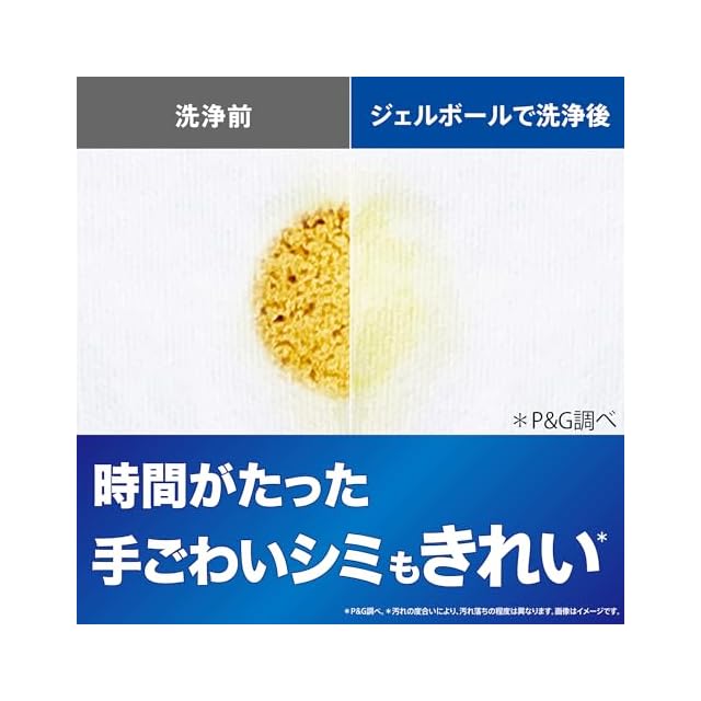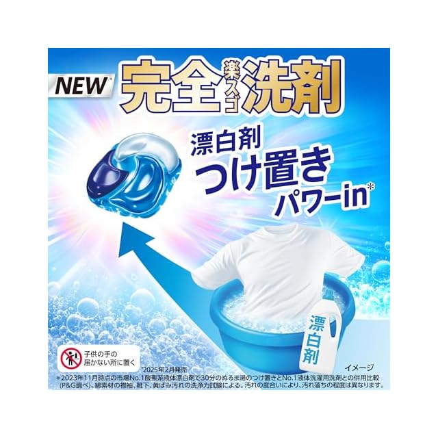 漂白剤つけ置きパワーin* (*2023年11月時点の市場No.1酸素系液体漂白剤で30分のぬるま湯のつけ置きとNo.1液体洗濯用洗剤との併用比較(P&G調べ)。綿素材の襟袖、靴下、黄ばみ汚れの洗浄力試験による。汚れの度合いにより、汚れ落ちの程度は異なります。)の「完全楽スゴ洗剤」ジェルボール