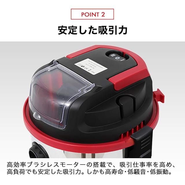【安定した吸引力】高効率ブラシレスモーター搭載で吸引仕事率を高め、高負荷でも安定した吸引力。しかも高寿命・低騒音・低振動。