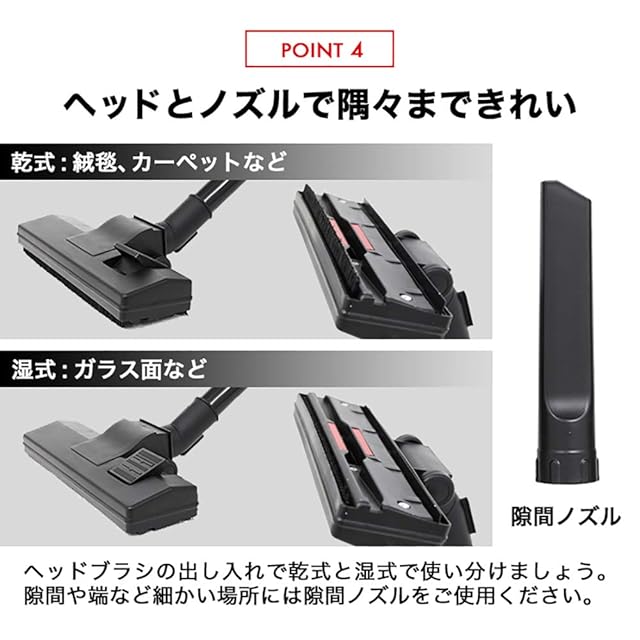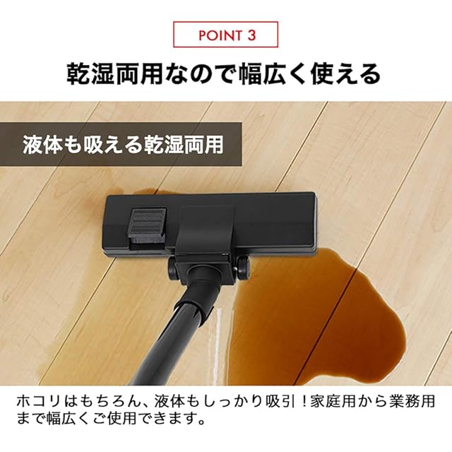 【乾湿両用なので幅広く使える】ホコリはもちろん、液体もしっかり吸引。家庭用から業務用まで幅広くご使用できます。乾式では絨毯やカーペットに、湿式ではガラス面などヘッドブラシの出し入れで乾式と湿式を使い分けられます。隙間や端など細かい場所には隙間ノズルをご使用ください。