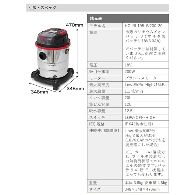 吸引仕事率:200W モーター:ブラシレスモーター 最大真空度:(Low:9kPa High:16kPa) 最大風量:1.1㎥/min タンク容量:20L 集じん容量:12L 吸水容量:12.5L スイッチ:LOW/OFF/HIGH
