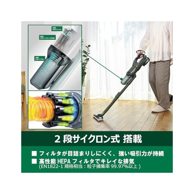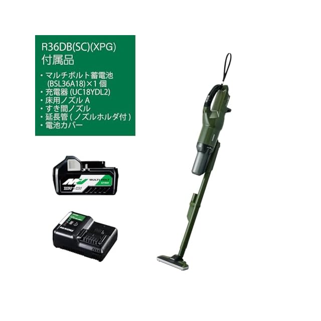 HiKOKI(ハイコーキ) 36V コードレス 掃除機 2段サイクロン式 ハンディ スティック クリーナー フォレストグリーン じゅうたん カーペット対応ノズル 最大吸い込み仕事率90W 軽量 1.8kg 蓄電池・充電器付き R36DB (SC)(XPG)