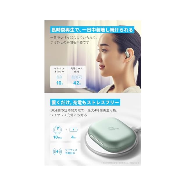 イヤホン単体で最大10時間の長時間再生で、一日中使える:一日中つけっぱなしでいられて、つけ外しの手間も不要です。また、約10分間の短時間充電で、最大4時間再生可能。ワイヤレス充電にも対応。