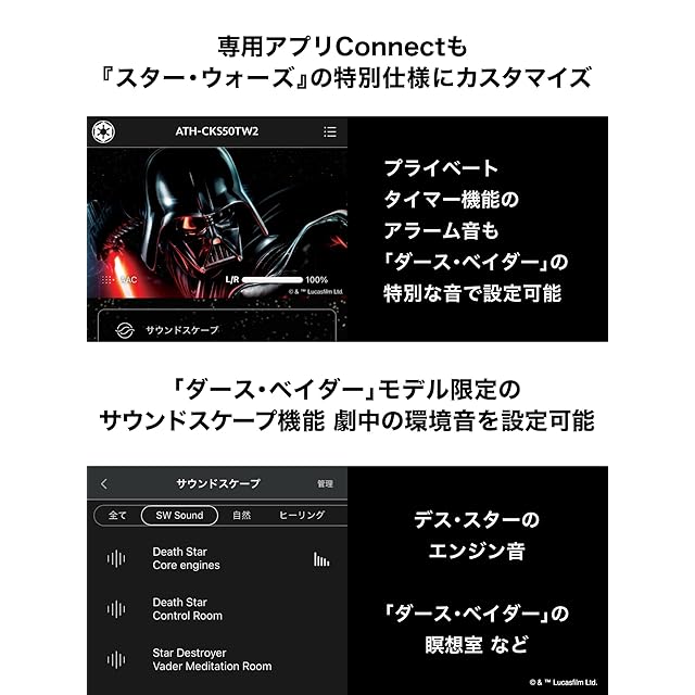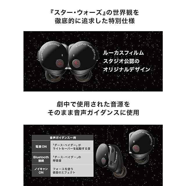 技適マーク認証済み商品(周波数帯:2.4G帯)『スター・ウォーズ』の世界観を徹底的に追及した特別仕様:今回のコラボレーションにあたり、ルーカスフィルムスタジオから特別にデザイン監修を受けて開発された公認プロダクトです。製品細部まで徹底的にこだわり抜き、『スター・ウォーズ』の世界観を再現しました。劇中で使用されている本物のオリジナルサウンドをそのままイヤホンの音声ガイダンスとして収録。起動時をはじめ、あらゆる場面で各モデルのキャラクターに関連するサウンドが楽しめます。
