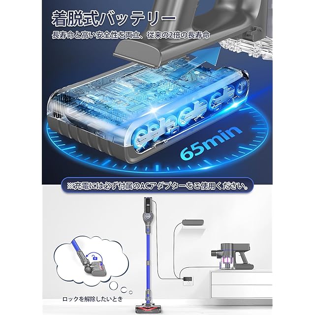 【左右180°上下90°回転・日本PSE認証済】掃除機は新開発の「V型絡まないブラシ」を採用することで、髪の毛に絡まないところはメリット!小回りの利くブラシヘッドは前後90・左右180°回転可能で、使う人の動きに合わせてスムーズに操作でき、最大限の機動性を提供します。従来より薄くなったので、ベッドや低い家具の下を快適に掃除でき、隅々まで届きます。「日本PSE認証済」本製品は日本国内PSE認証の監査を通過しているので、日本の安全基準を厳格に遵守し、高品質と安全性をし、安心してご利用いただけます。PSE認証は、製品の使用中の安全性を確保し、長時間の信頼性のある動作を実現し、ご家族により高い安全性を提供します。このPSE認証済みの掃除機を選んで、掃除をより安心で便利にし、安全で清潔な住環境を楽しみましょう!
