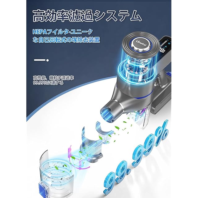 【複数の濾過システム、お手入れ簡単】HS9専用に、前所未有な自転式ダスターを搭載!フィルター内部の金網に溜まった頑固なホコリを自動でかき取るので、吸引力が常に新品同様となり、フィルターのメンテナンスも簡単になります。手動でこする必要がないため、フィルターの詰まりによる吸引力の低下を完全に防ぎます。サイクロン式ダストコレクターとHEPAフィルターにより、99.99%のホコリを捕らえ、浄化されたアレルギーフリーの空気を放出します。花粉症患者にも優しく、二次汚染を引き起こすことなくろ過します。さらに、ダストカップは取り外して分解可能で、丸ごと水洗いもOK!定期的に洗うことで、吸引力を長く持続させることができます。