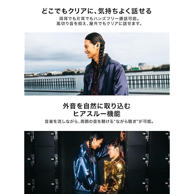 ヒアスルー機能とトークスルー機能:音楽を流しながら散歩やスポーツ、家事やテレワークをする際や、電車やバスでの通勤・ 通学時に周囲の音を気にしながらリスニングしたいときに便利です。コンビニのレジでのちょっとした会話や、駅や空港などのアナウンスを“とっさに”聴きた いときに最適な機能です。