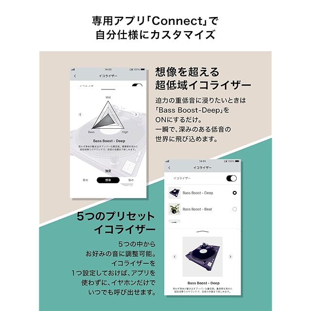 想像を超える、超低域イコライザー:迫力の重低音に浸りたいときは、専用プリセットイコライザー「Bass Boost - Deep」をON にするだけ。通常のイコライザー調整範囲よりさらに低い音域の「超低域」を拡張することができます。小さなイヤホンからは想像できない、深みのある低音の世界に飛び込めます。