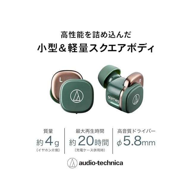 オーディオテクニカ ATH-SQ1TW2 GR ワイヤレスイヤホン bluetooth 小型 軽量 / 最大20時間再生 / 低遅延/外音取込み/マルチポイント/マルチペアリング/防水 IPX5 / ワイヤレス充電 /【国内正規品】グリーン ATH-SQ1TW2 GR