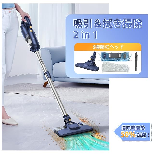 【水拭き!床モップ一体型・33kPa吸引】 新しい1台2役の掃除機で、床掃除がもっと効率的に! ゴミを吸引した後、水タンクを設置し、簡単に床をモップ掛け。水タンクのオン/オフボタンで、簡単に切り替え可能です。驚異的な33,000Paの吸引力で、微細なホコリから大きなゴミまでしっかり吸い取ります。カーペットやフローリングにも対応し、家全体を効率よく清掃できます。