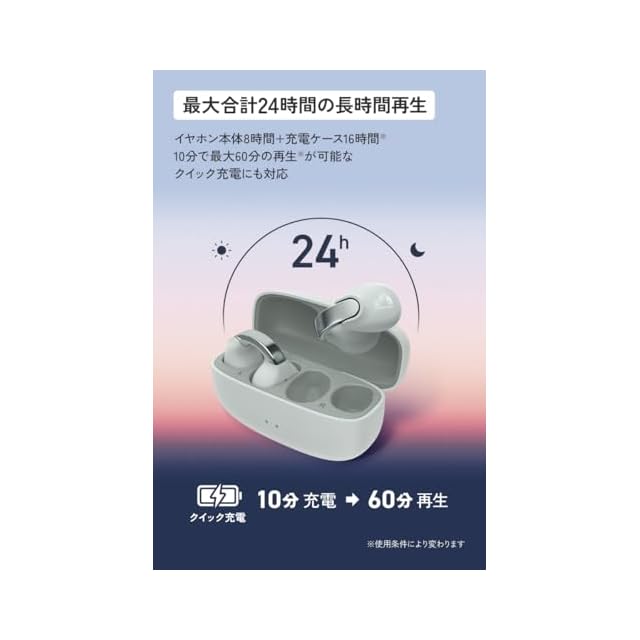 【最大24時間※の長時間再生が可能】 片耳約4.9gと小型・軽量ボディながら、本体のみで最大8時間※の連続再生が可能。さらに、充電ケースによるフル充電(最大16時間※)と合わせると、最大24時間※1の長時間再生が可能です。また、充電ケースは約30gの軽量・薄型のコンパクトサイズで、ポケットに収まりやすく、小さなバッグなどでも持ち運びがしやすいようにしました。なお、10分の充電で最大60分※の再生が可能なクイック充電にも対応します。※使用条件により変わります。