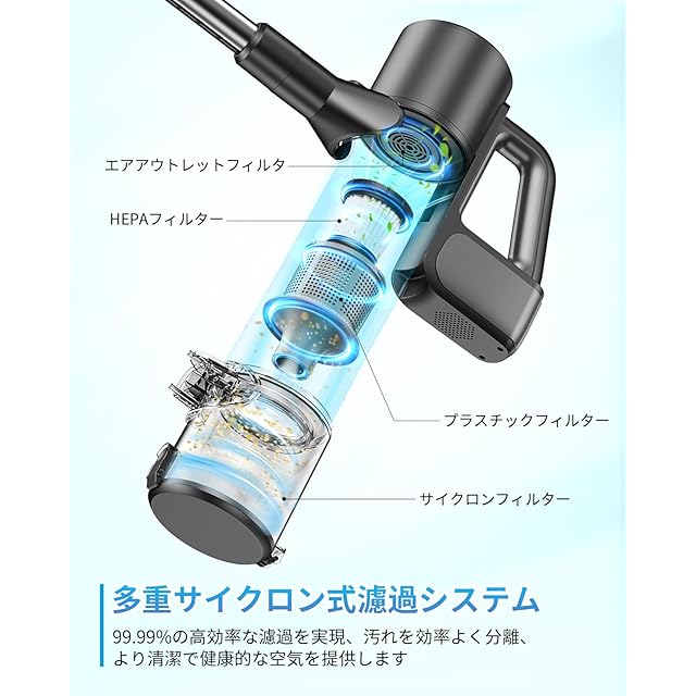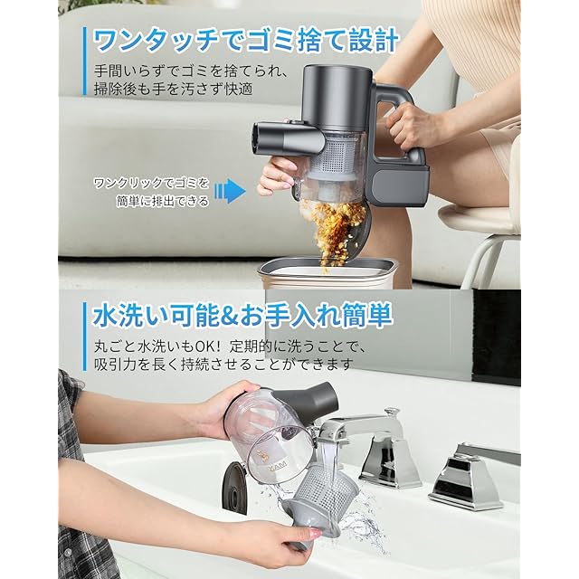【多重濾過システム&1L大容量&お手入れ簡単】5段階のフィルターシステムを採用し、微細なホコリや粒子をしっかりキャッチし、清潔な空気を排出します。 サイクロン式設計により、フィルターの目詰まりを防ぎ、長時間にわたって強力な吸引力を維持。二次汚染も防止し、フィルターの寿命を延ばし、メンテナンスの手間を削減します。1Lの大容量ダストカップは、ワンタッチで簡単にゴミを捨てられる便利な設計。さらに、ダストカップは取り外して分解可能で、丸ごと水洗いもOK!定期的に洗うことで、吸引力を長く持続させることができます。