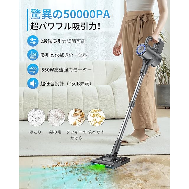 商品名:掃除機 コードレス【2025最新型!50000pa超強力吸引&水タンク付きクリーニング設計&LED緑ライト付き】 Linkifly A9 コードレス掃除機 自立式 伸縮型 スティック ハンディクリーナー サイクロン HEPA多重濾過・サイクロン・2WAY・軽量・低騒音・急速充電・大容量バッテリー・多機能 ・アフターサービス ペット毛や床・カーペット掃除に最適