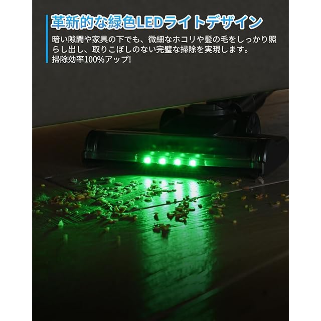 【革新的なLED緑ライトで、ホコリを見逃さない】このコードレス 掃除機は、革新的なLEDグリーンライト機能を搭載しており、暗い場所や家具の下に隠れたホコリを的確に照らし出し、清掃をより効率的かつ徹底的に行うことができます。隅々や隙間、低い家具の下など、緑色の光が微細なホコリや汚れをくっきりと映し出し、見逃しを防ぎます。肉眼では見つけにくい微小な粒子も、グリーンライトの照射によって簡単に発見でき、清掃の質を大幅に向上させます。昼間でも夜間でも、クリアな視界を提供し、清掃作業を効率的に進めることが可能です。さらに、グリーンライトの特殊な波長設計により、ホコリの反射効果が高まり、床の上の細かい粒子やペットの毛、カーペットの奥に詰まった汚れの除去に特に効果的です。この機能により、家中のあらゆる場所を徹底的に清掃し、清潔な環境を保つことができます。