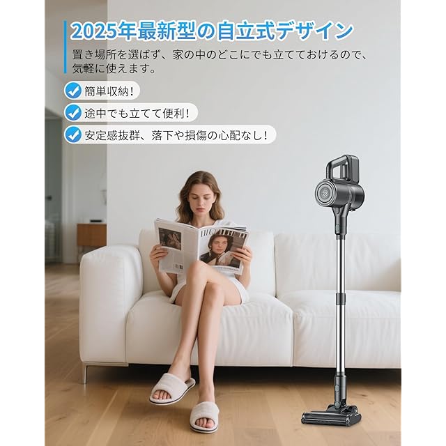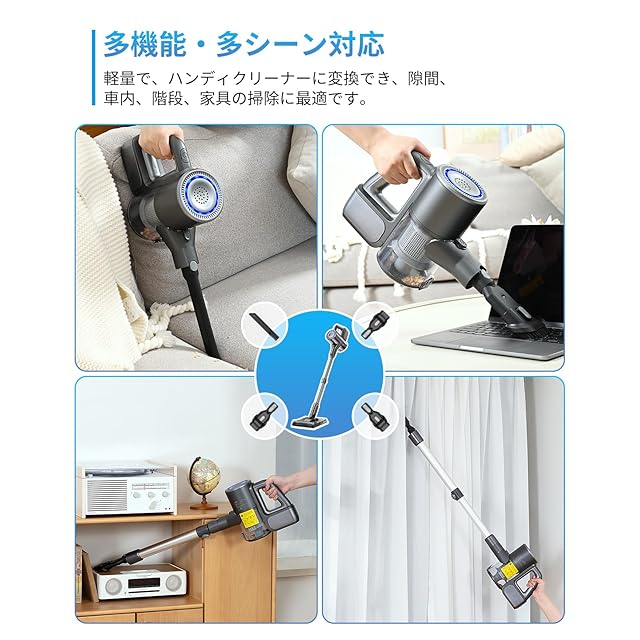 【軽量&独自な自立式設計&多機能・コードレス設計】重量はわずか2.4kg。軽量設計により片手で持ち運びが簡単。自立するデザインで、掃除中でも収納時でも便利に使えます。スペースを取らず、どこでも簡単に置け、手軽に取り出して使えます。富なブラシとノズルが付属しており、家具の隙間、階段、フローリング、カーペット、車内など、さまざまな場所を効率的に掃除できます。調整可能な伸縮パイプで高所や狭い隙間も楽に掃除可能。コードレス設計で、コードに邪魔されることなく自由に動けます。